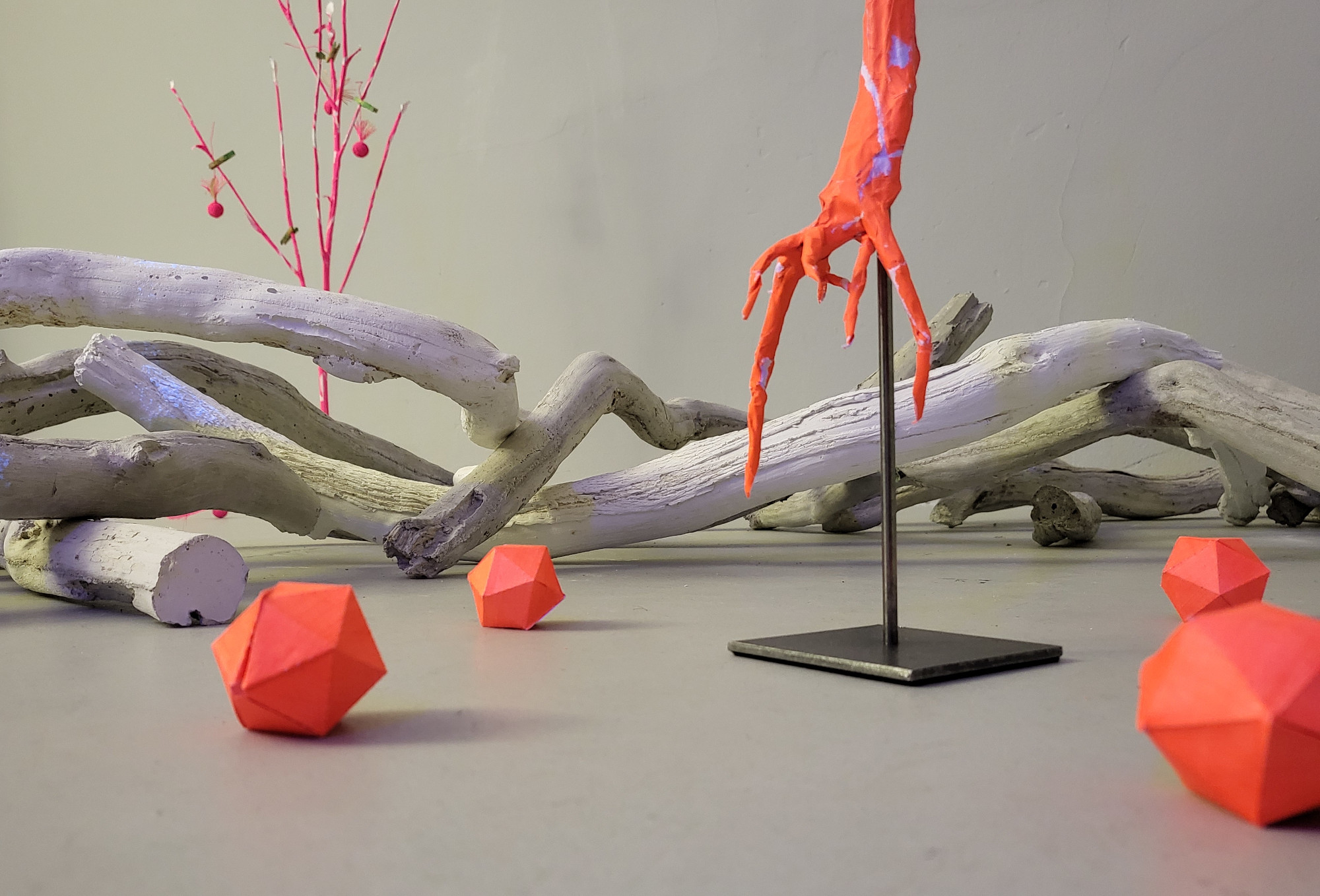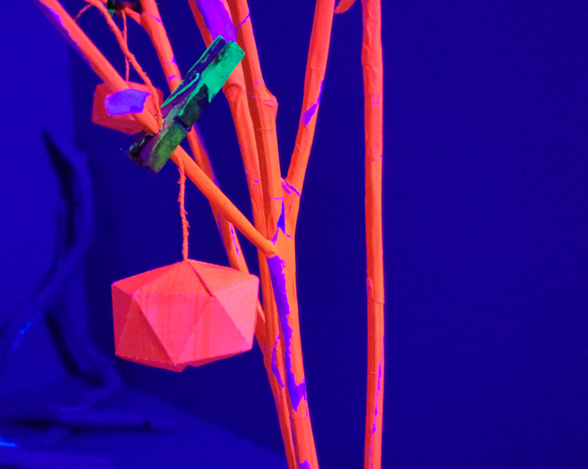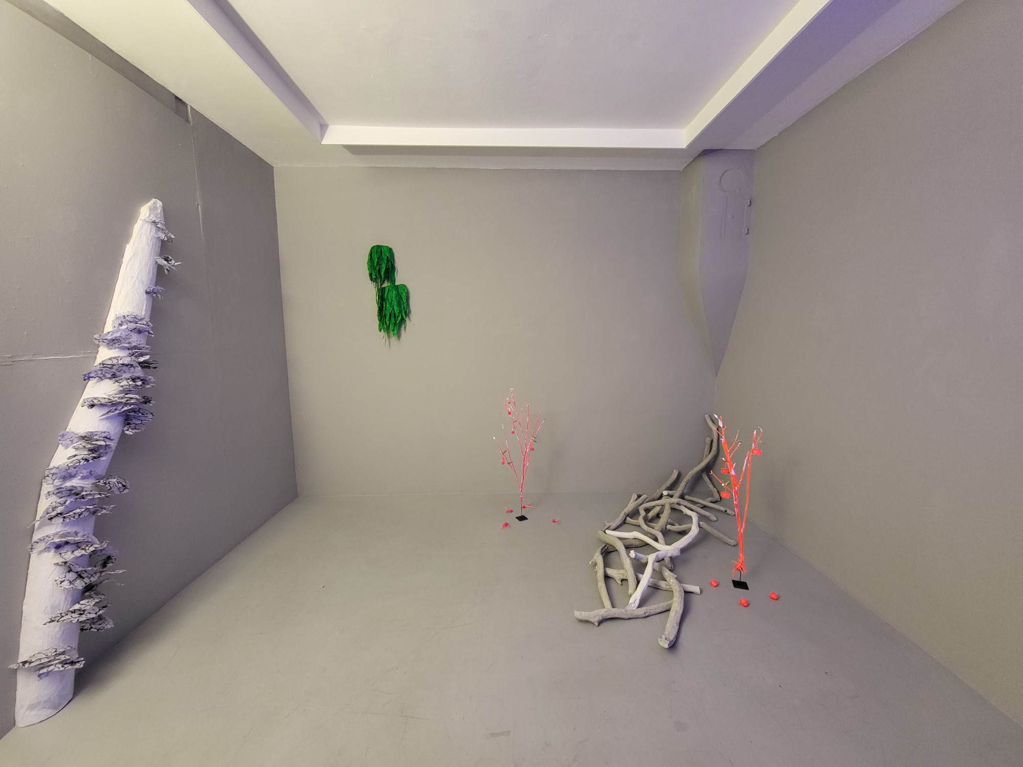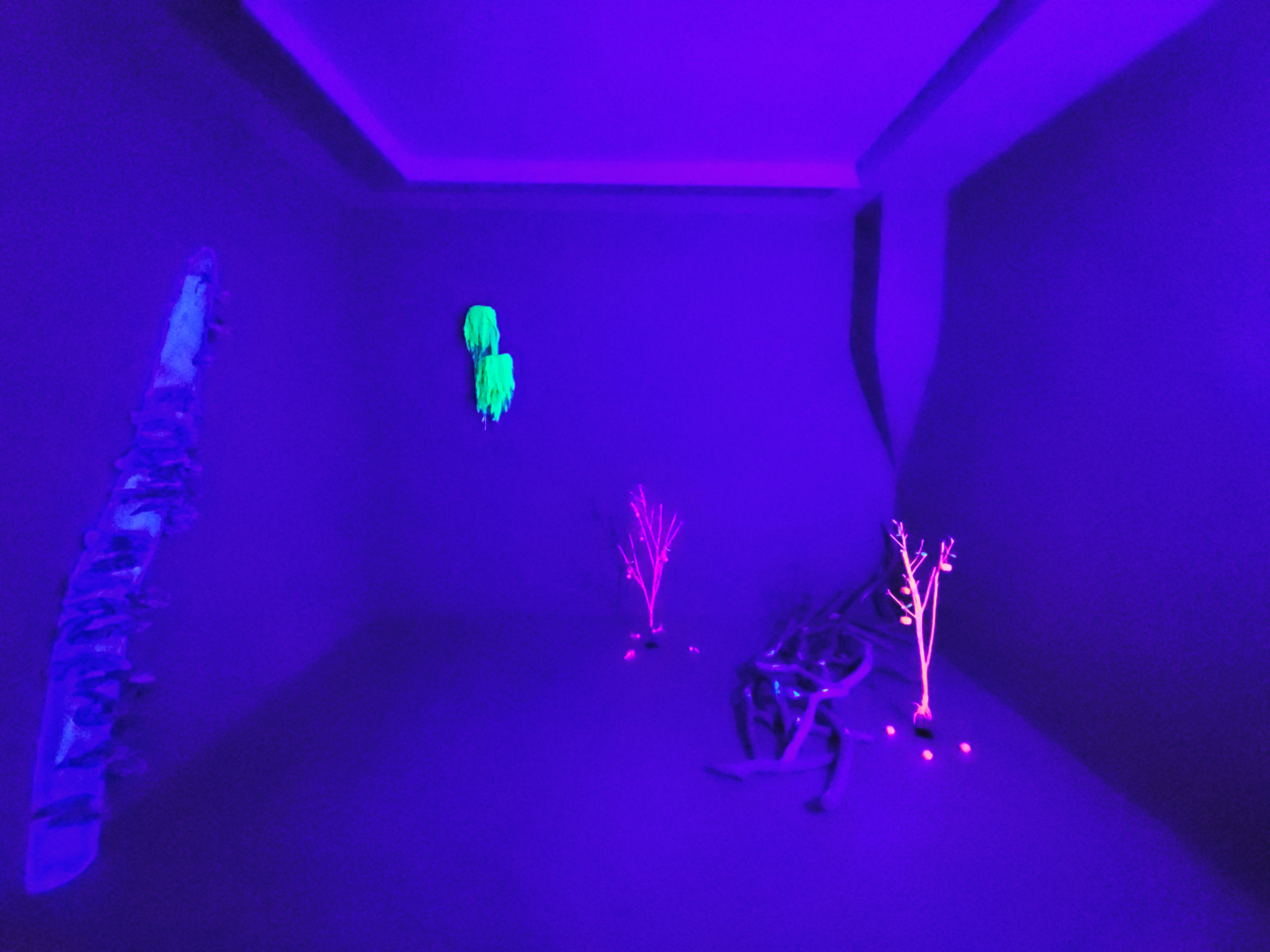 In FLUOROSPHÄR zeigt Bettina Bosch die gleichnamige Installation, die durch den Wechsel unterschiedlicher Lichtsituationen den Eindruck eines Tag-Nacht-Rhythmus erfahrbar macht. Der Raum verändert sich in diesem Lichtwechsel vollständig und offenbart Dinge, die im jeweils anderen Zustand verborgen bleiben.