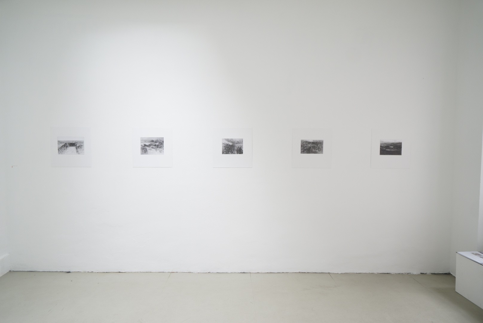 Marek Kralewski ist erfreut Dieter Maertens' 2015 entstandene Serien-Sammlung »Zeichnung zum Krieg« erstmals zu zeigen. In seinen Zeichnungen transformiert Dieter Maertens die Barberei des Krieges mittels Graphit auf Papier. In zunehmenden Abstraktionsgraden wird die Gewalt und Brutalität des Sujets, in eben so brutal und gewalttätig ausgeführtem Strich, dargestellt in Form von zerstörten Landschaften, Explosionen und Stätten des Grauens. Während der Mensch in dieser ersten Serie vollkommen fehlt und nur die Auswirkungen seiner Handlungen zu erahnen sind, zeigt Dieter Maertens in einer Mappe eine weitere Serie mit grotesk verzerrten und grob gezeichneten fratzenähnlichen Bildnissen von Tätern.