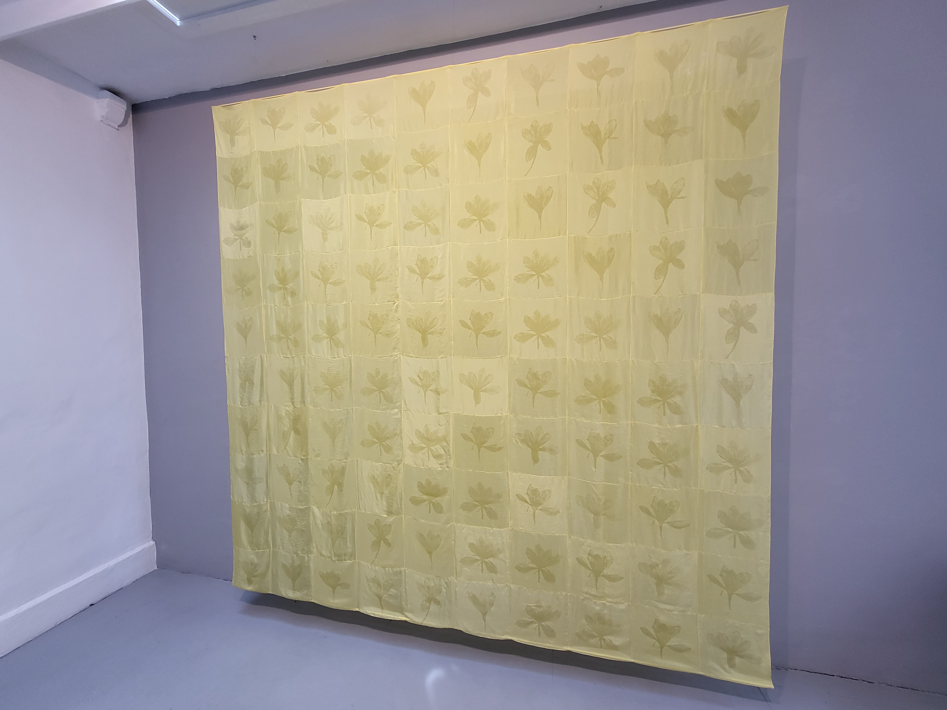 ARUUNOMMNA, 2023, Siebdruck auf Seide, Safrantinte, ca. 270 x 270 cm