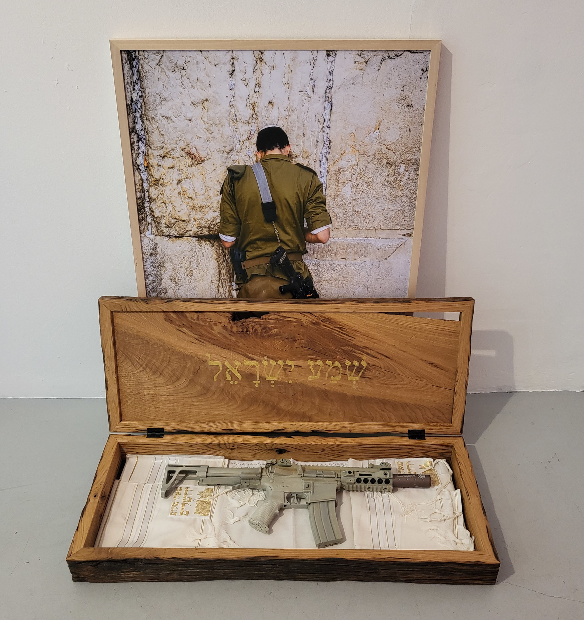שְׁמַעיִשְׂרָאֵל, Kastenobjekt mit Sturmgewehr und Tallit, 2025