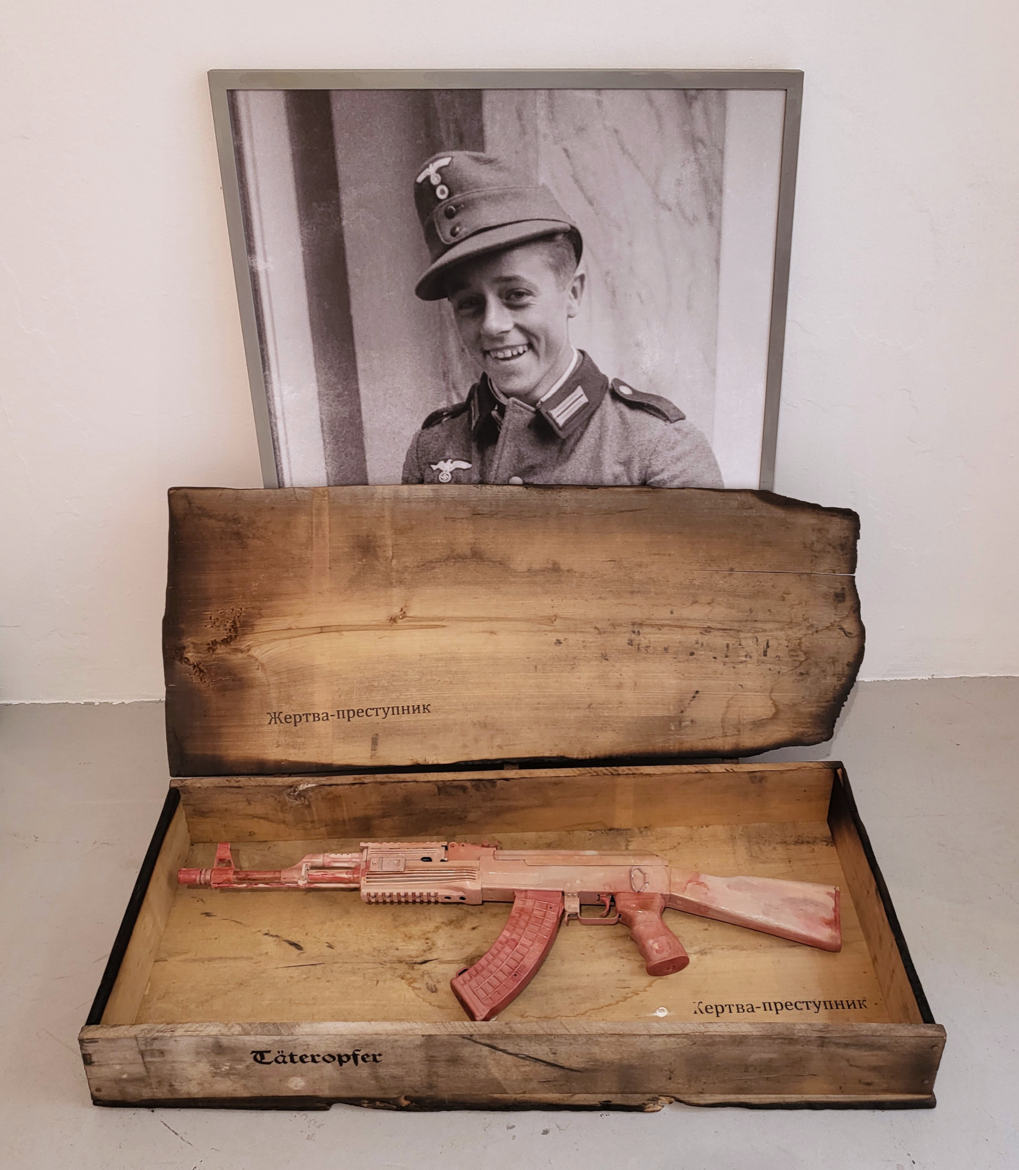 Жертва-преступник, Kastenobjekt mit AK 47 (mit farbiger Fassung), 2025