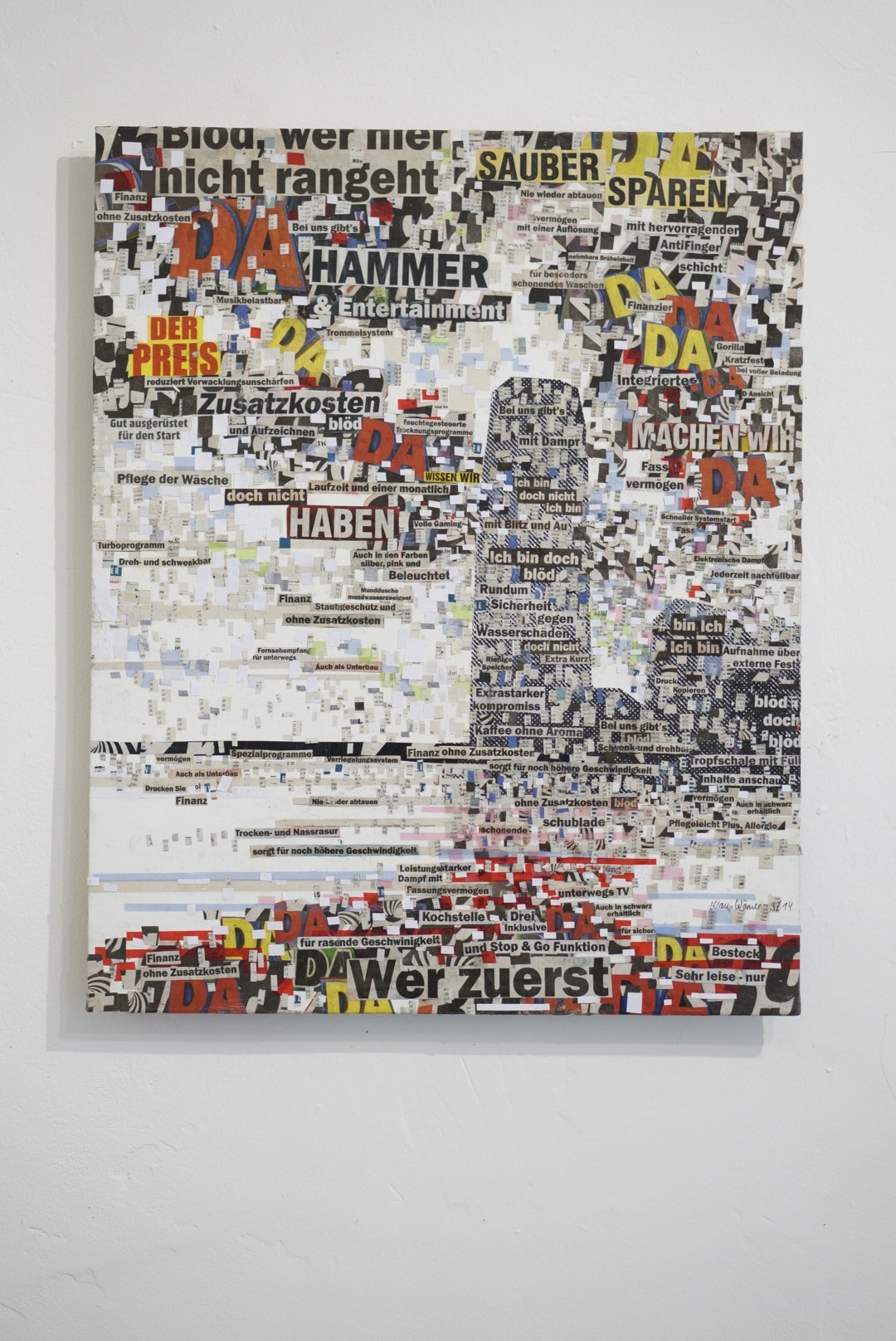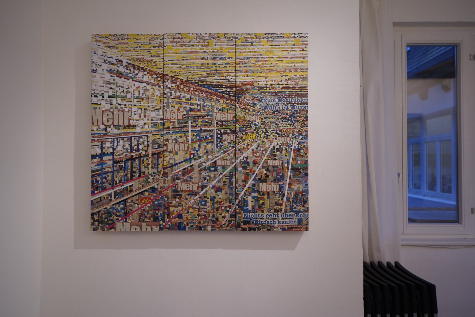 Klaus Wörner zeigt Werke aus seinem Bilderzyklus »Konsumräume« in denen er den kreativen Output der Werbeindustrie aufnimmt und in neuen Kontext setzt. Seine Bilder entstehen aus den selben freihaus gelieferten Prospekten, die sonst zumeist den direkten Weg zur Entsorgung nehmen. So entzieht er einen Teil der aufwändig produzierten Verbraucherinformationen dem natürlichen Kreislauf von Kreation zur Produktion und anschließender Vernichtung und transformiert diese auf eine Ebene in der ein tieferes Verständnis der Verhältnisse ermöglicht wird. Dass das Ergebnis eine Nähe zu DADA aufweist, liegt in der Natur der Sache.