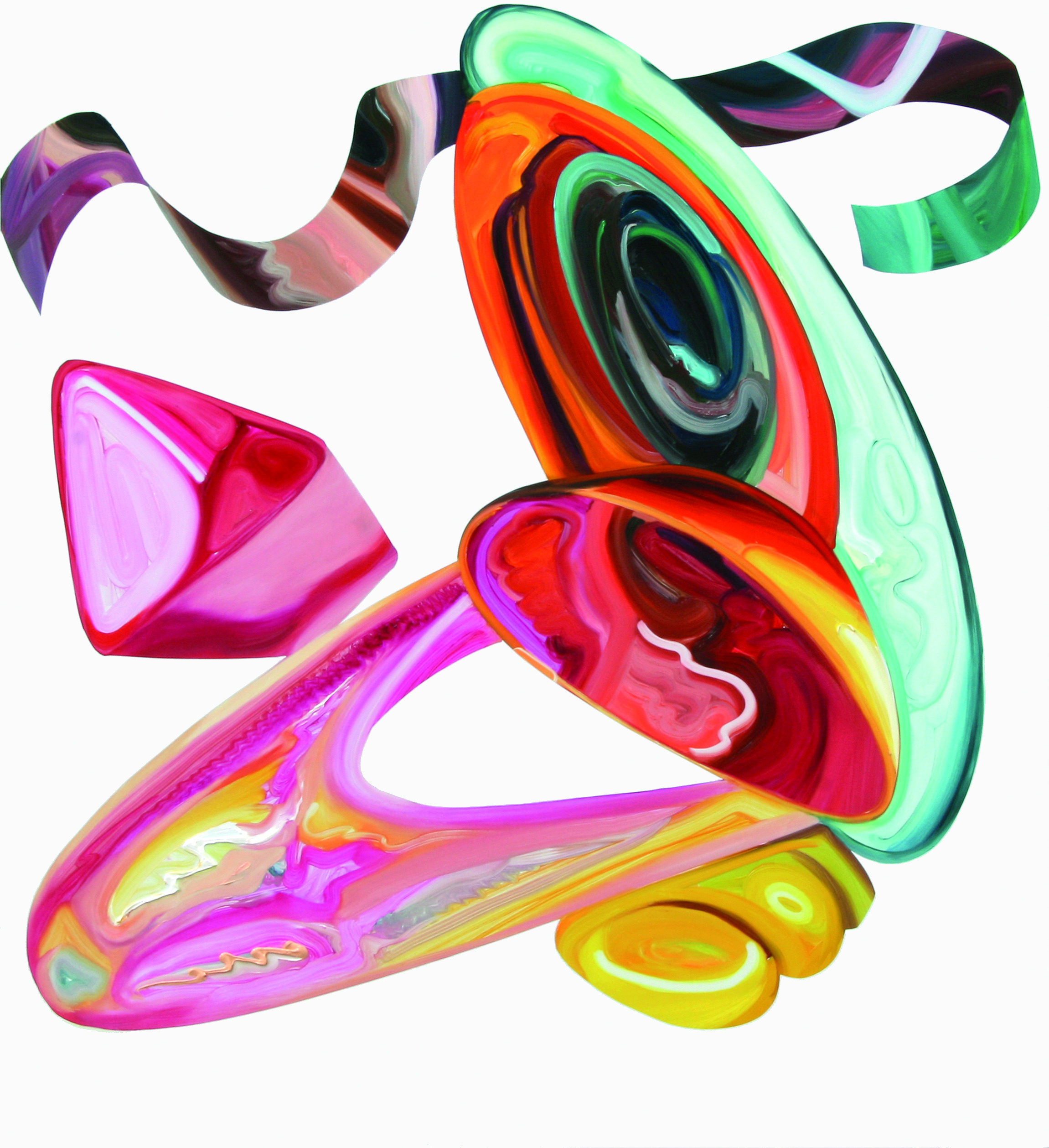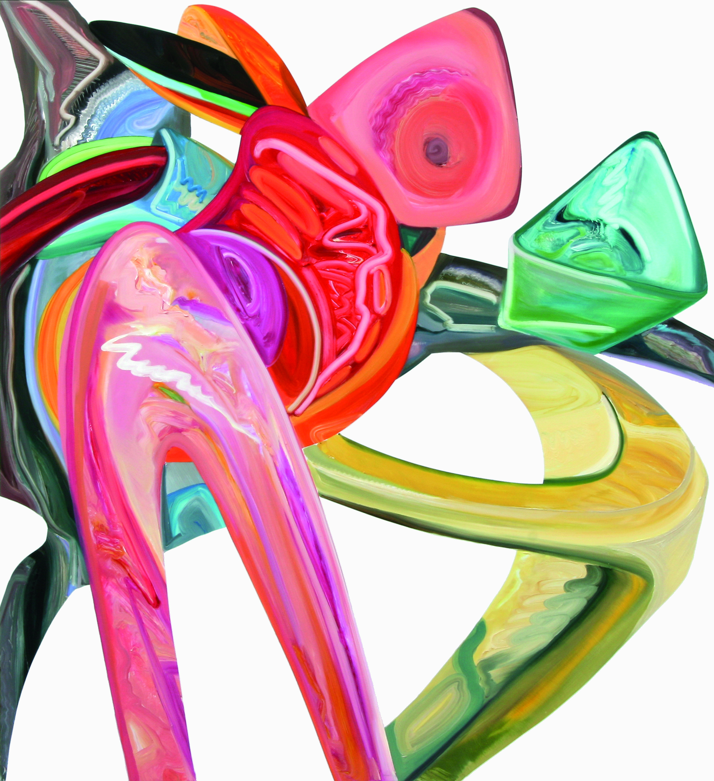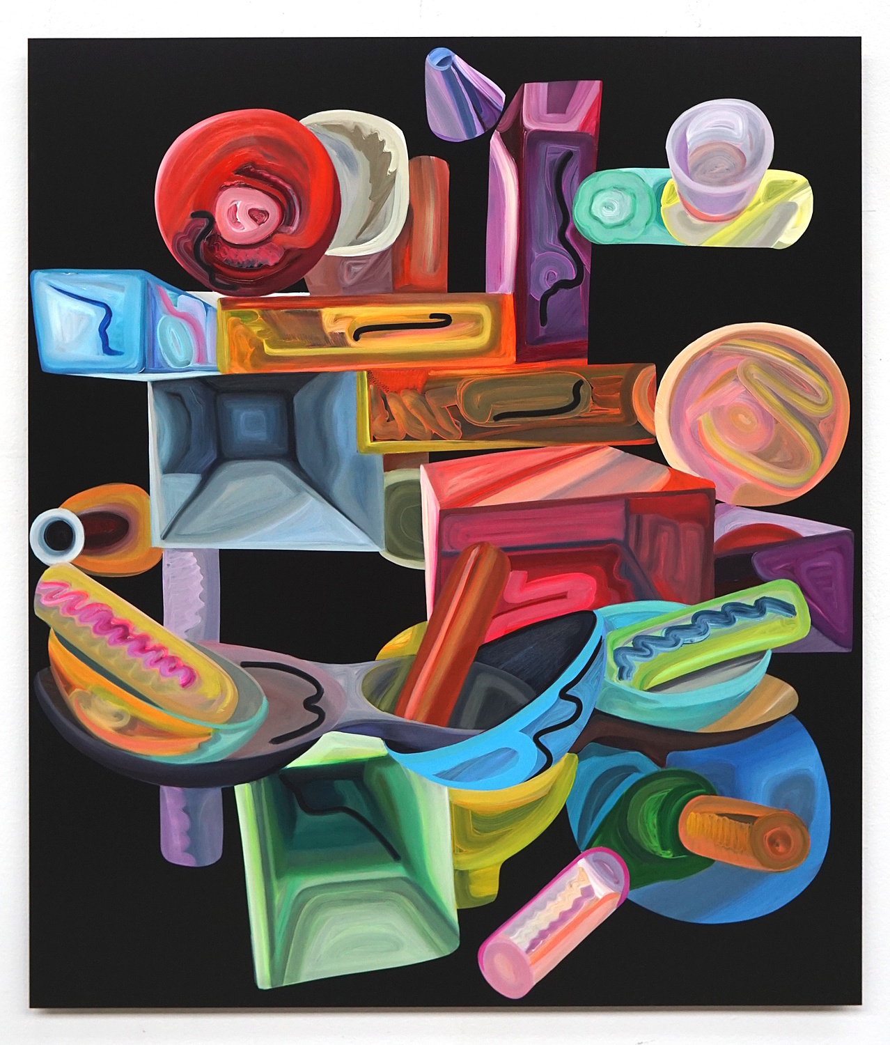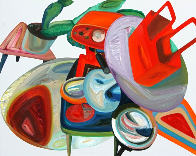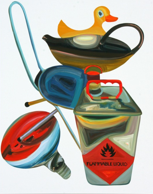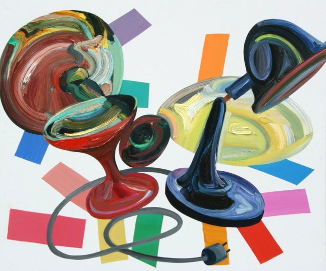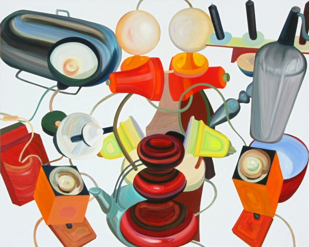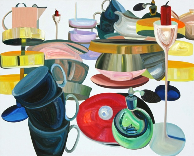 In Elisabeth Bereznickis Arbeiten wird die Form der Dinge als Gefäß benutzt. So erscheinen uns die mit Farbe befüllten Umrisse als alltäglich bekannte Utensilien. Stühle, Lampen, Tischchen, Tassen, Bücher, Badeenten und vieles andere, scheinbar Vertraute, meinen wir zu entdecken.