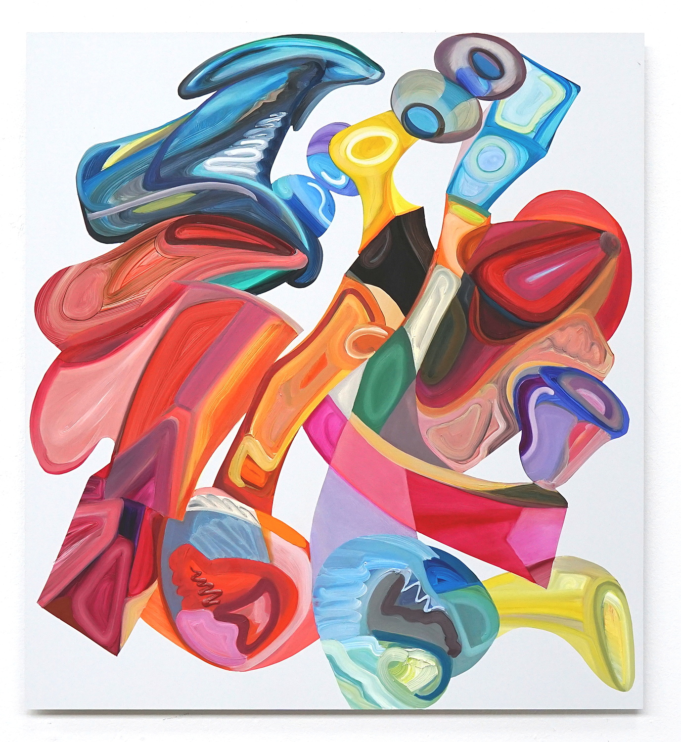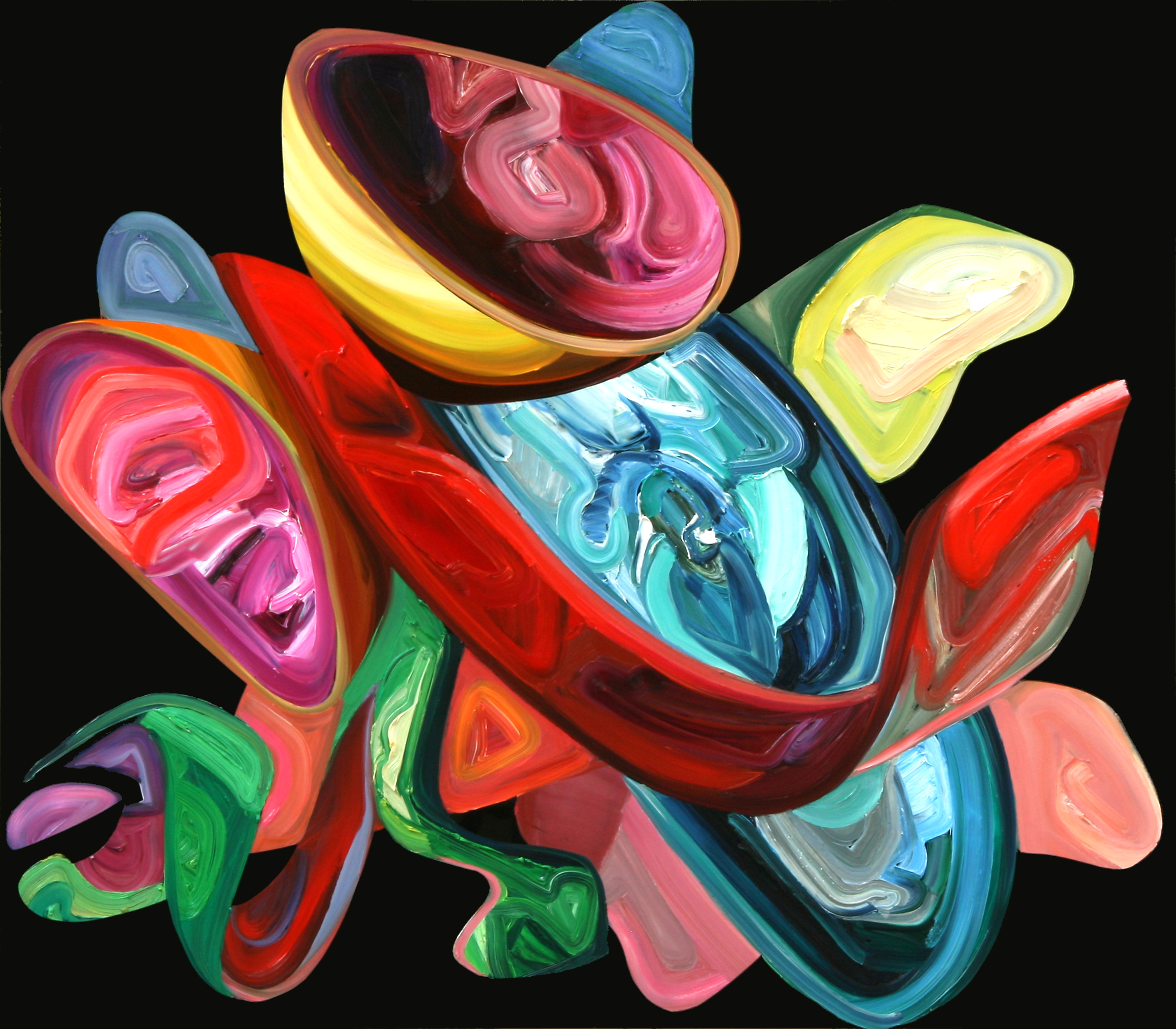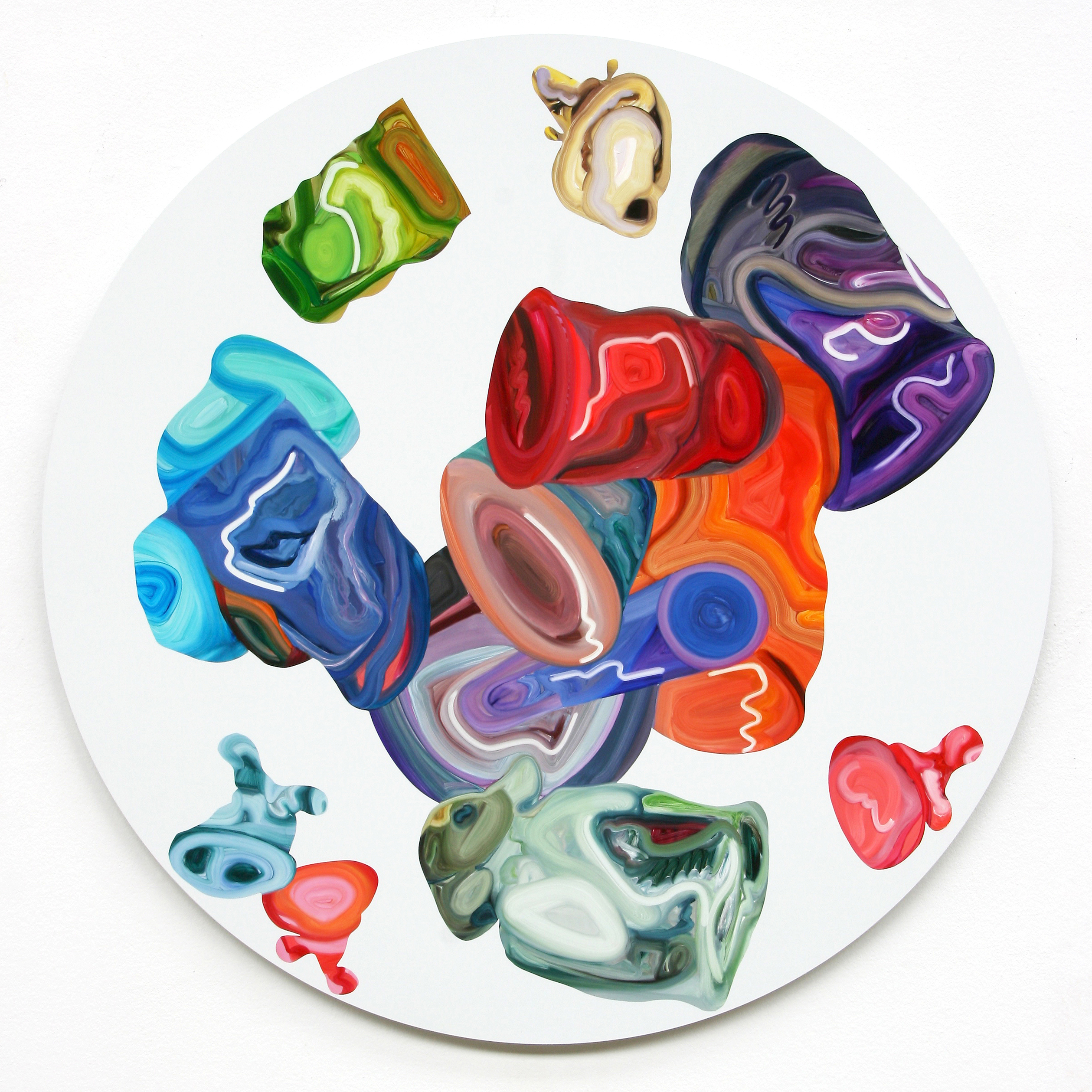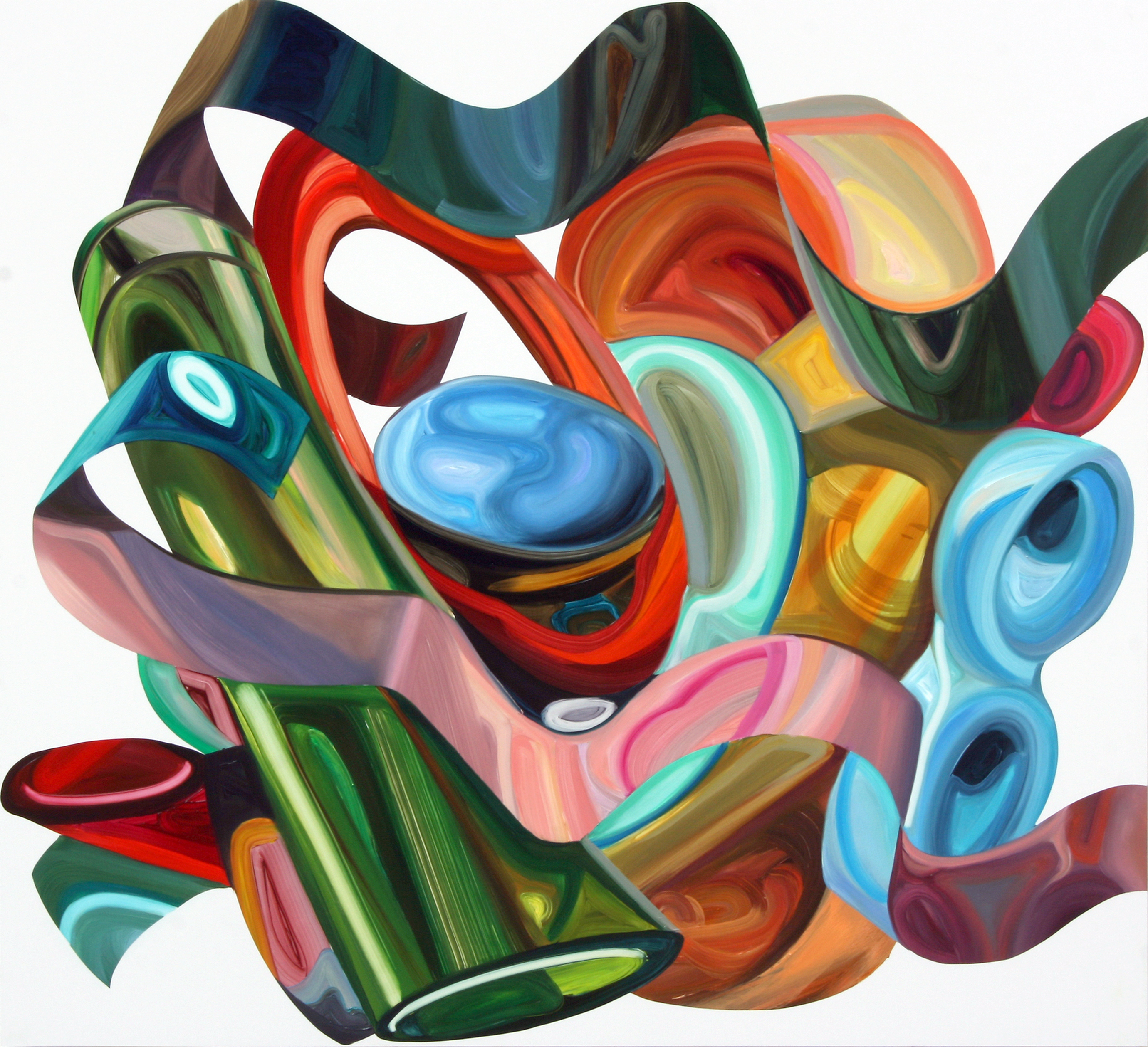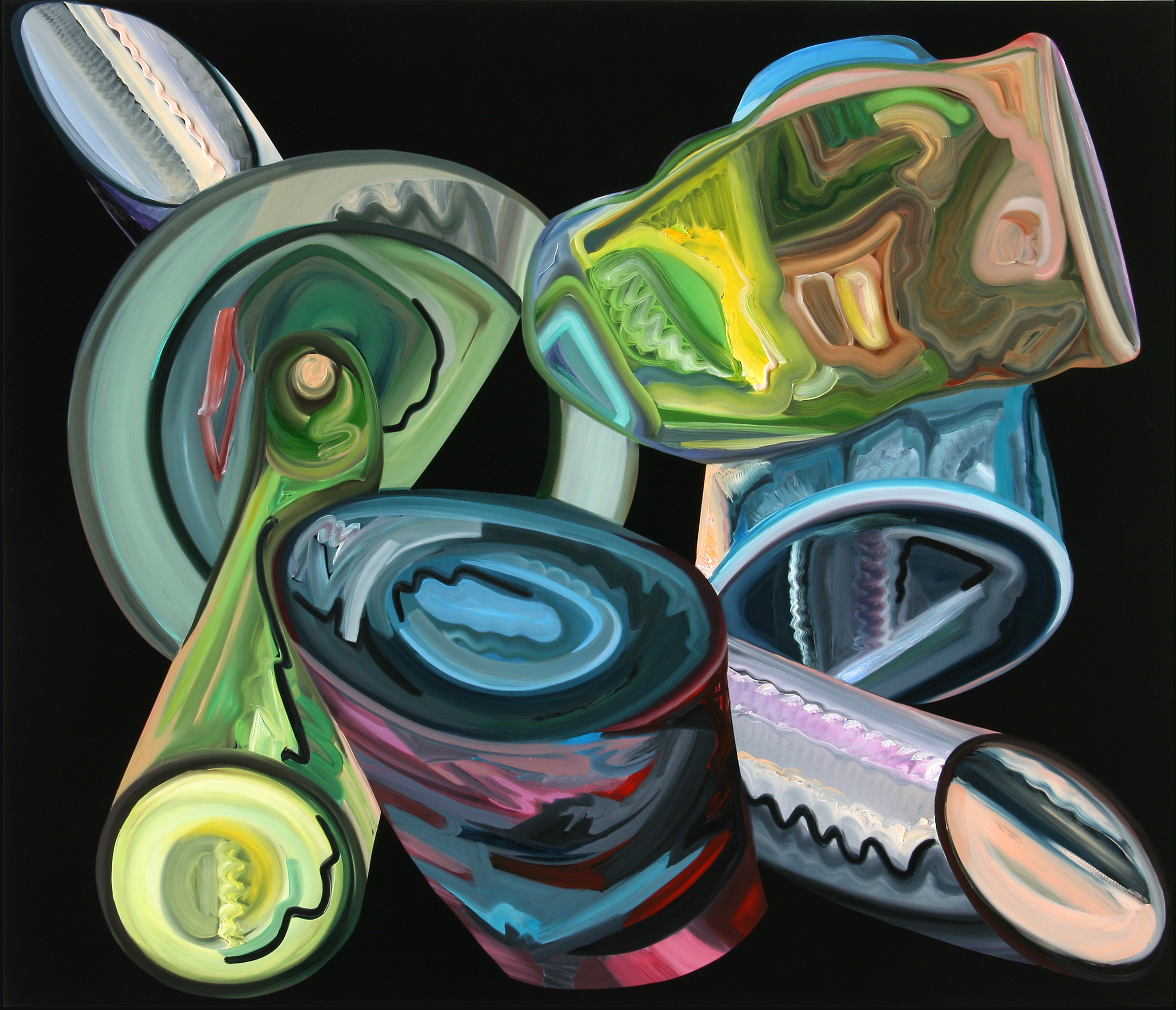 In Elisabeth Bereznickis Arbeiten wird die Form der Dinge als Gefäß benutzt. So erscheinen uns die mit Farbe befüllten Umrisse als alltäglich bekannte Utensilien. Stühle, Lampen, Tischchen, Tassen, Bücher, Badeenten und vieles andere, scheinbar Vertraute, meinen wir zu entdecken.