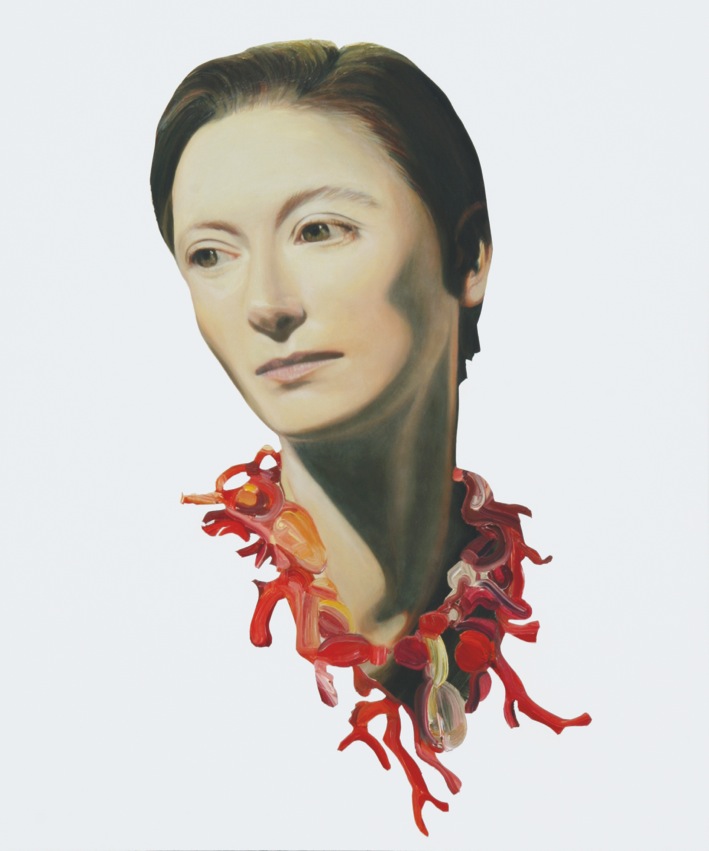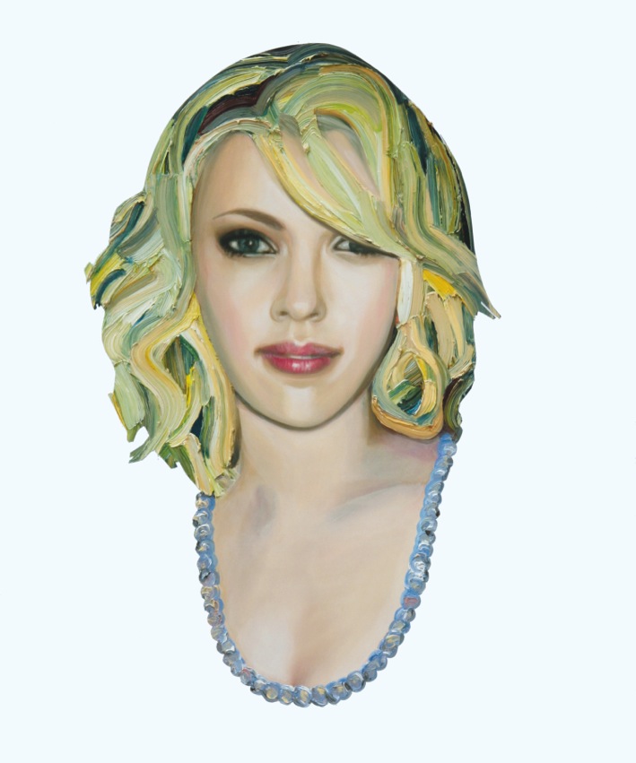 In ihren Portraits von Stars und VIPs werden Kleider und Haare wild und pastös gemalt, treten hervor aus der glatten Bildfläche (Aludibond) und werden zugleich der Realität entzogen, während die bekannten Gesichter mit ihren feinen Zügen einen Halt anbieten.