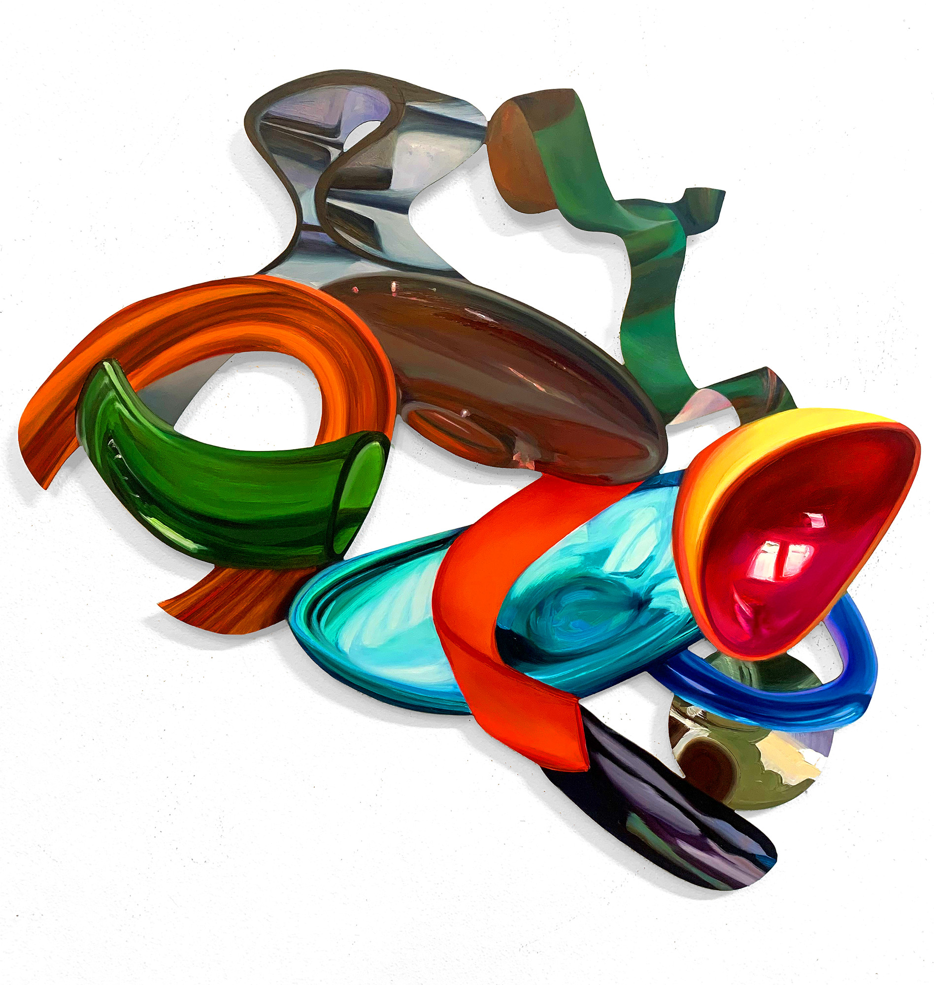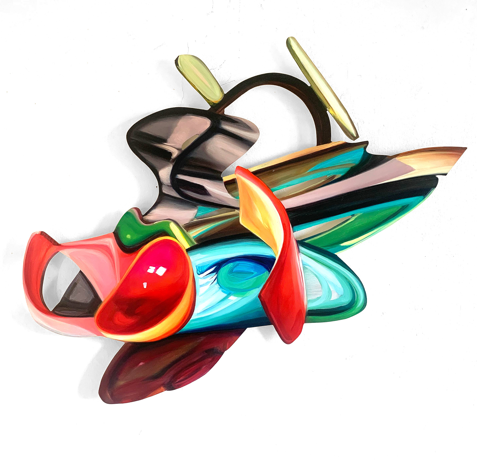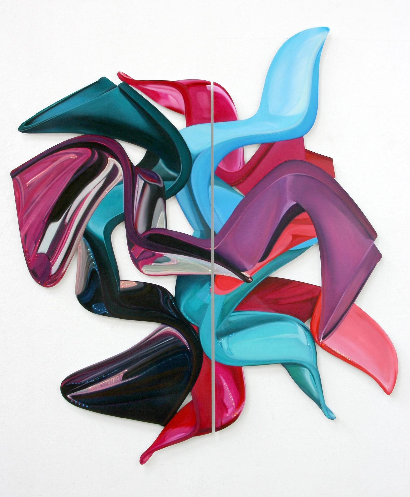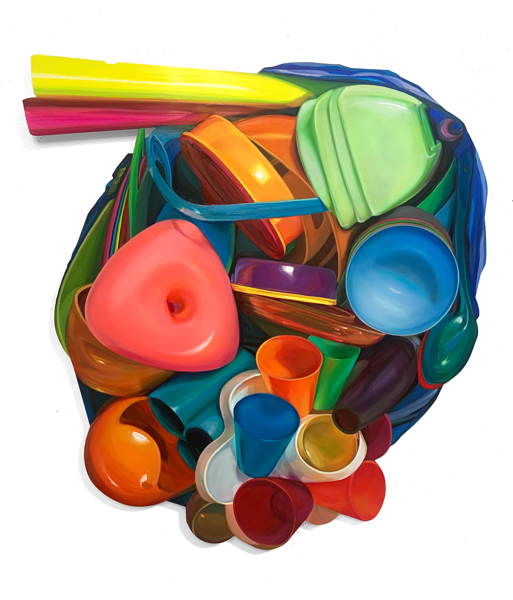 In Elisabeth Bereznickis Arbeiten wird die Form der Dinge als Gefäß benutzt. So erscheinen uns die mit Farbe befüllten Umrisse als alltäglich bekannte Utensilien. Stühle, Lampen, Tischchen, Tassen, Bücher, Badeenten und vieles andere, scheinbar Vertraute, meinen wir zu entdecken.