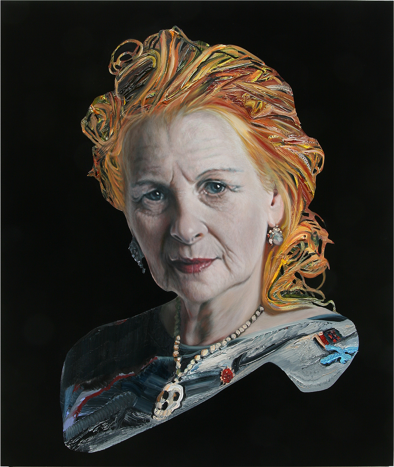 In ihren Portraits von Stars und VIPs werden Kleider und Haare wild und pastös gemalt, treten hervor aus der glatten Bildfläche (Aludibond) und werden zugleich der Realität entzogen, während die bekannten Gesichter mit ihren feinen Zügen einen Halt anbieten.